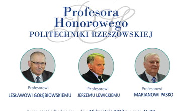 Uroczystość nadania Profesora Honorowego Politechniki Rzeszowskiej prof. Lesławowi GOŁĘBIOWSKIEMU, prof. Jerzemu LEWICKIEMU oraz prof. Marianowi PASKO odbędzie się 18 kwietnia o godz. 11.00 w auli V1.